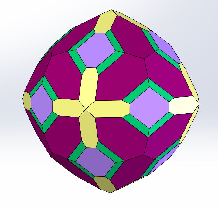 Angles and face shapes were calculated with the assistance of CAD modeling, and are accurate enough for educational use. That is to say, the models are not simply artistic interpretations of what a crystal looks like, they are actual three dimensional renderings of the crystal forms and their combinations. The angles I calculate during the planning stages are accurate to two decimal places. The angles on a finished model are as close to that ideal as my tools, materials, eyes, and hands allow. Here’s one of my CAD models next to the wood model I eventually made.
