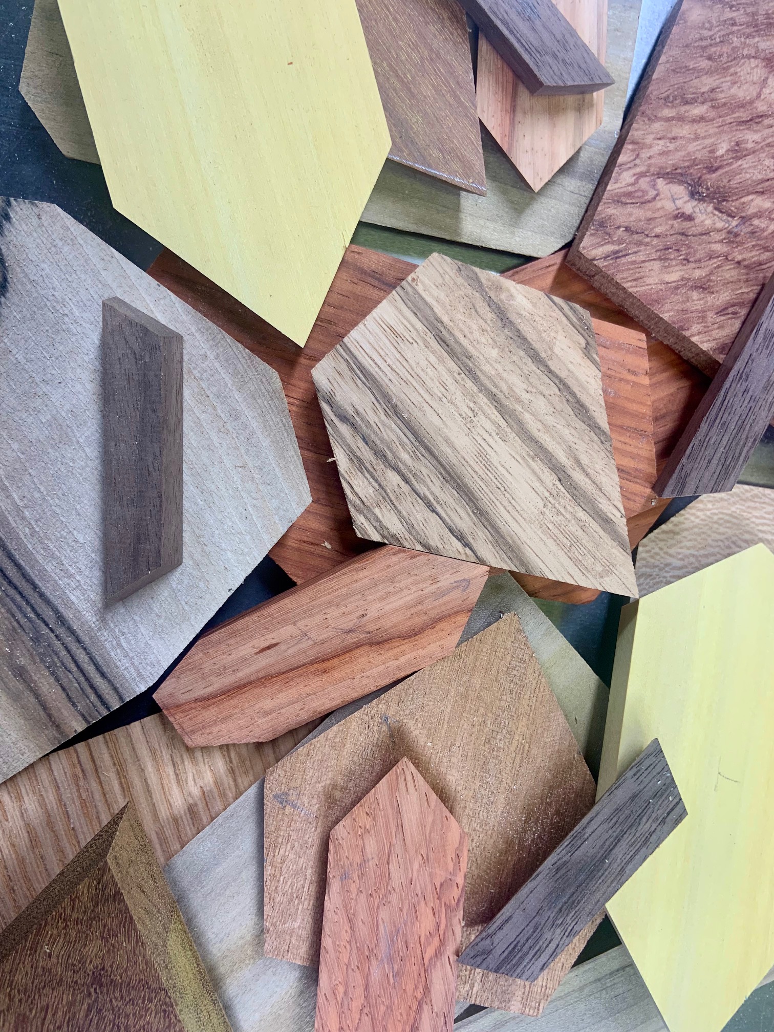 Sometimes I try to use woods with a strong, straight grain to represent striations (which the zebra wood for the pyritohedron faces accomplishes on the model pictured above), or I’ll pair light and dark shades of similar color across twin boundaries.