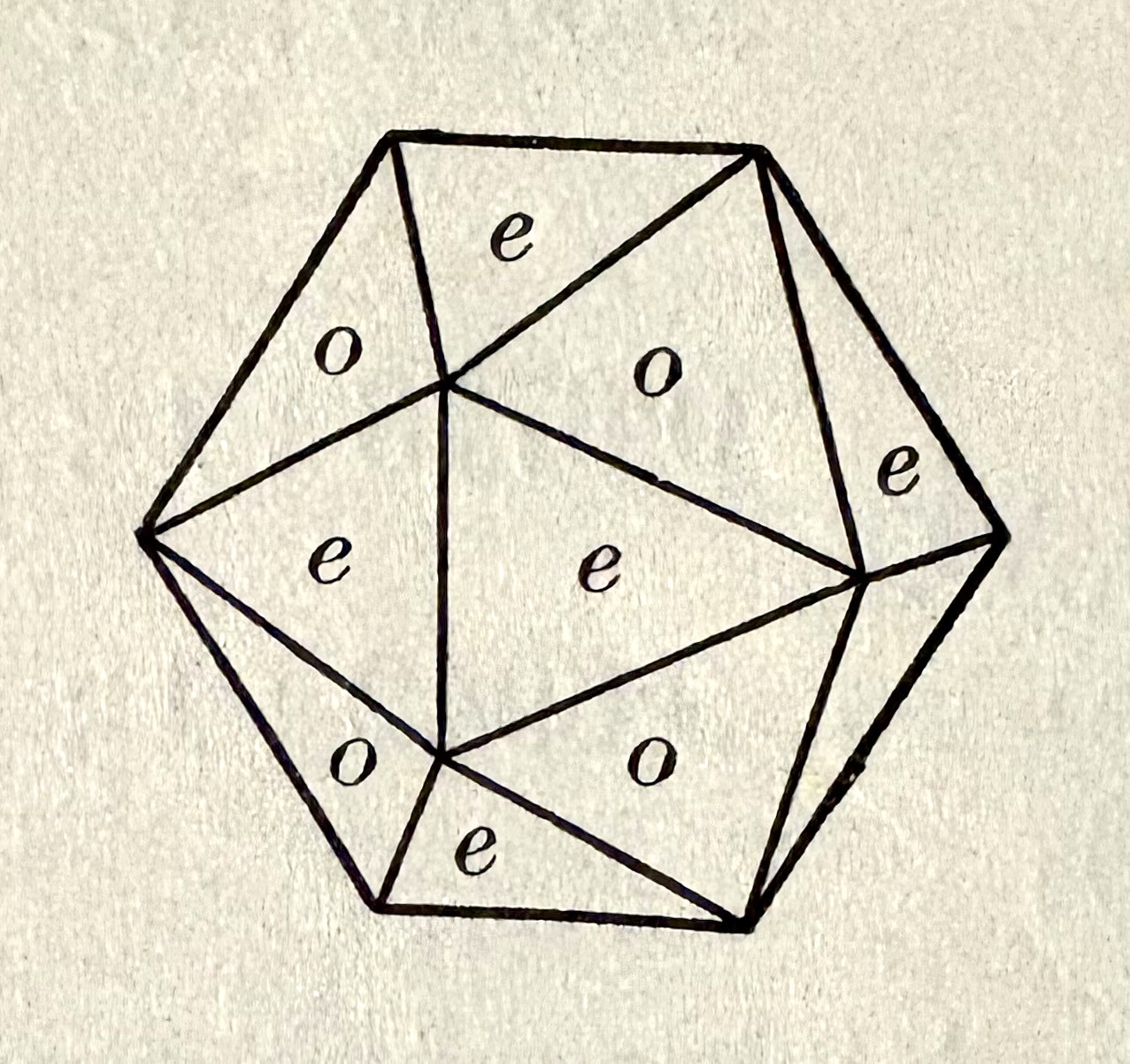 The wood used in these models is chosen to produce a pleasing color scheme. Normally, each crystal form in a model is assigned one type of wood, so the resulting pattern of colors can help make the interaction of multiple forms clearer. In the example below, it’s a little harder to see the pattern of the octahedron and pyritohedron faces in the line drawing.