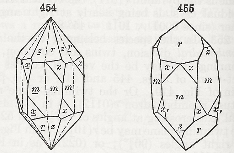 The models shown on this page are either representations of real crystals that I have handled personally, or recreations of well-known diagrams in Dana’s A Textbook of Mineralogy, 4th ed., edited by W.E. Ford. Here’s an example of a figure from the book and the models that represent it.