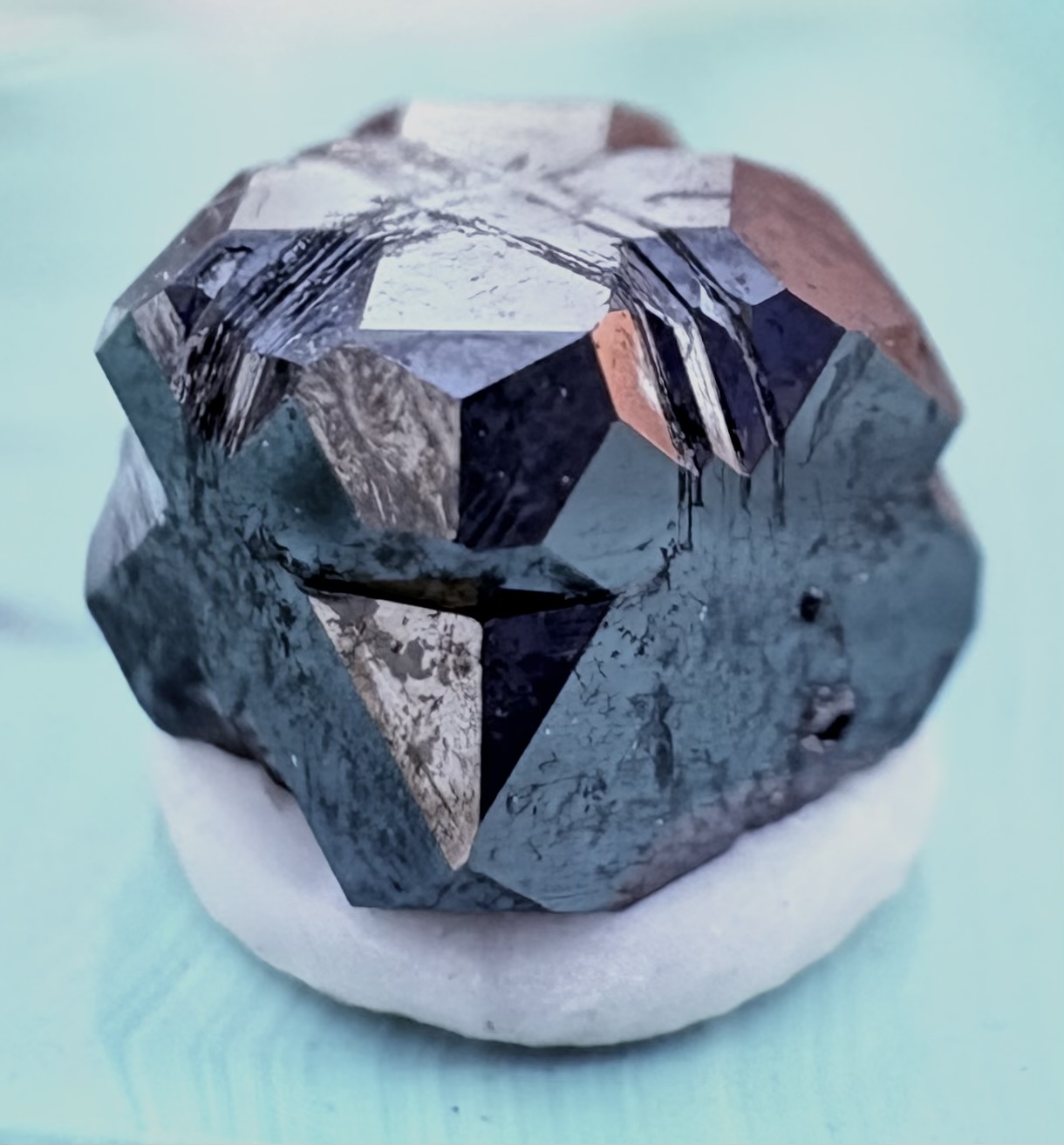 Specimen details: Bixbyite crystal with braunite lamellae. Thomas Range, Juab Co., Utah. 5mm crystal