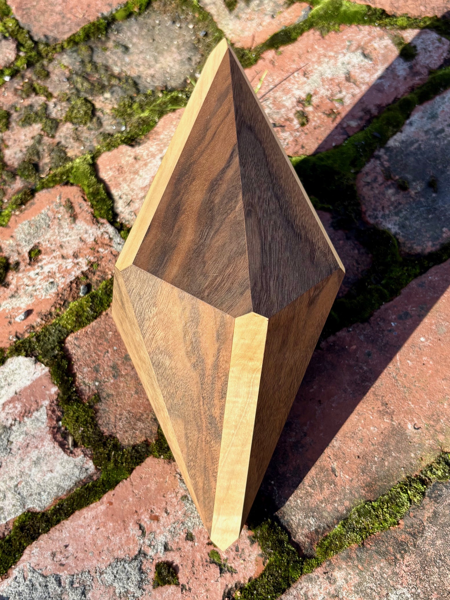 Model details: 7.5" from tip to tip. Scalenohedron faces are English walnut, and rhombohedron faces are flame maple.