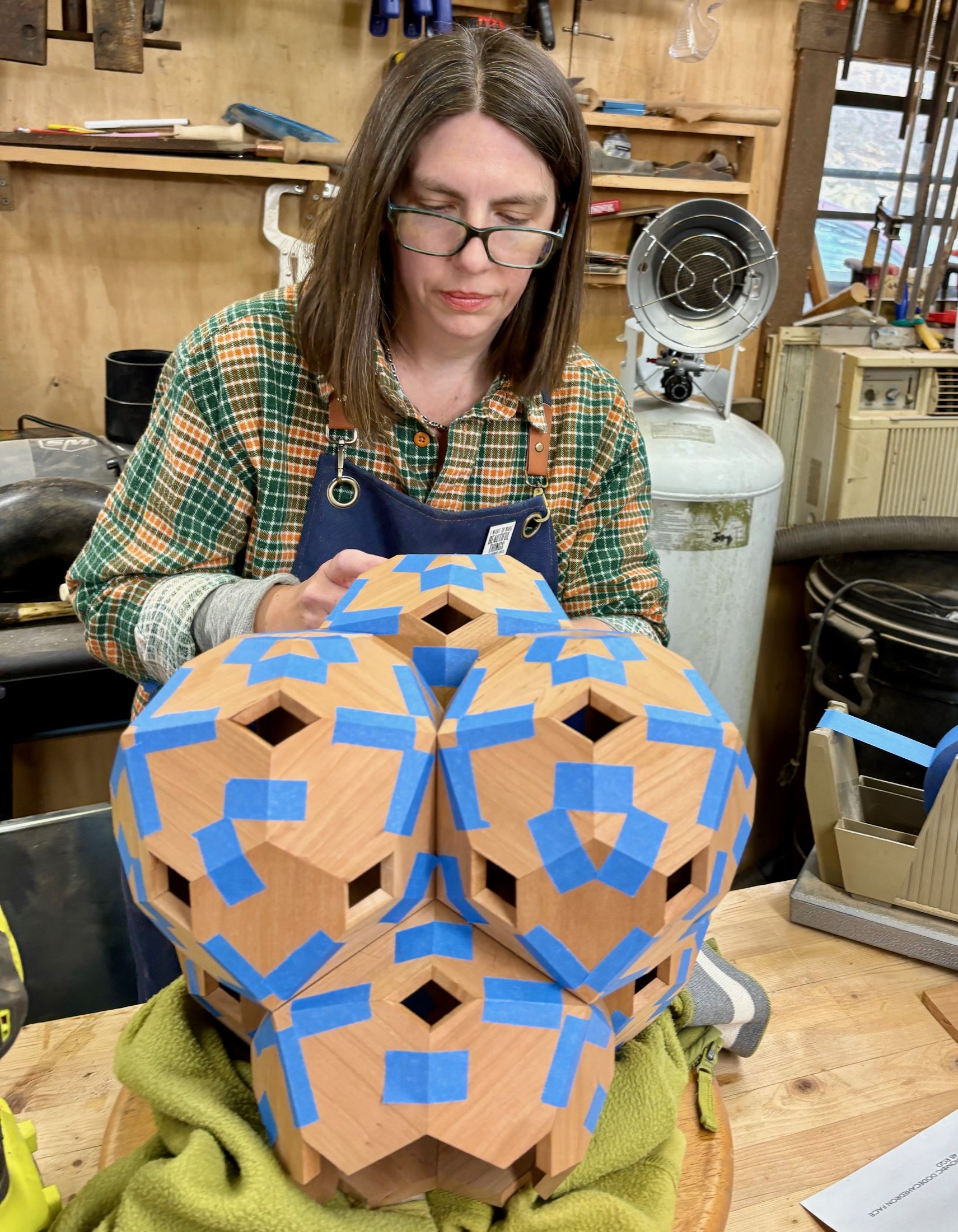 Model details: 15" across opposite points. Trapezohedron faces are cherry, and dodecahedron faces are birdseye maple.