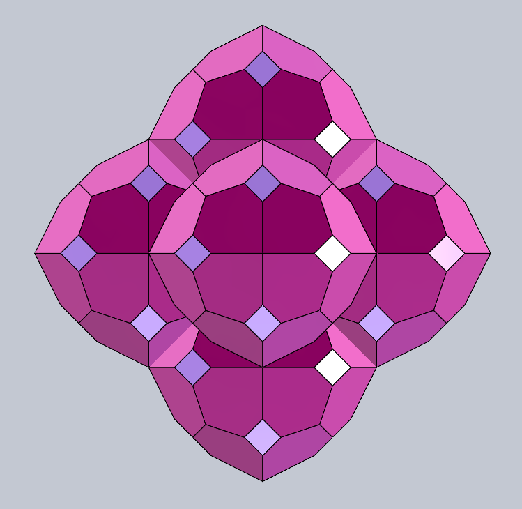 Making a CAD model of the outside surface of the garnet wasn’t hard. The screenshot on the left above shows my CAD model. Figuring out how to make actual three dimensional pieces of wood do what I needed them to do was much more difficult. The photo on the right shows the trouble spot - the place where two fourfold vertices touch at a single point. At least, that’s what happens on the outside. Since a real piece of wood has thickness, it’s what’s happening on the inside that presented the real challenge.