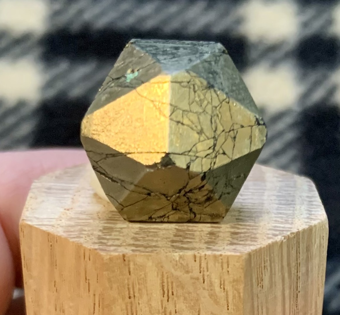 Specimen details: Pyrite crystal with pyritohedron and octahedron faces. Bingham Pit, Bingham, Utah. 2.5 cm across.