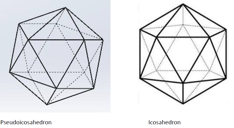 You can see the pseudoicosahedron looks slightly skewed in comparison with the icosahedron. That’s because the octahedron face triangles are a little bit different from the pyritohedron face triangles. The fact that there are two different types of triangles, and the fact that they correspond to isometric crystal forms that aren’t actually related to an icosahedron means that the resemblance between the two shapes, uncanny as it is, is only an illusion. Pyrite crystals that form with this habit retain the characteristic symmetry of their crystal class, and do not have 5-fold axes of symmetry.