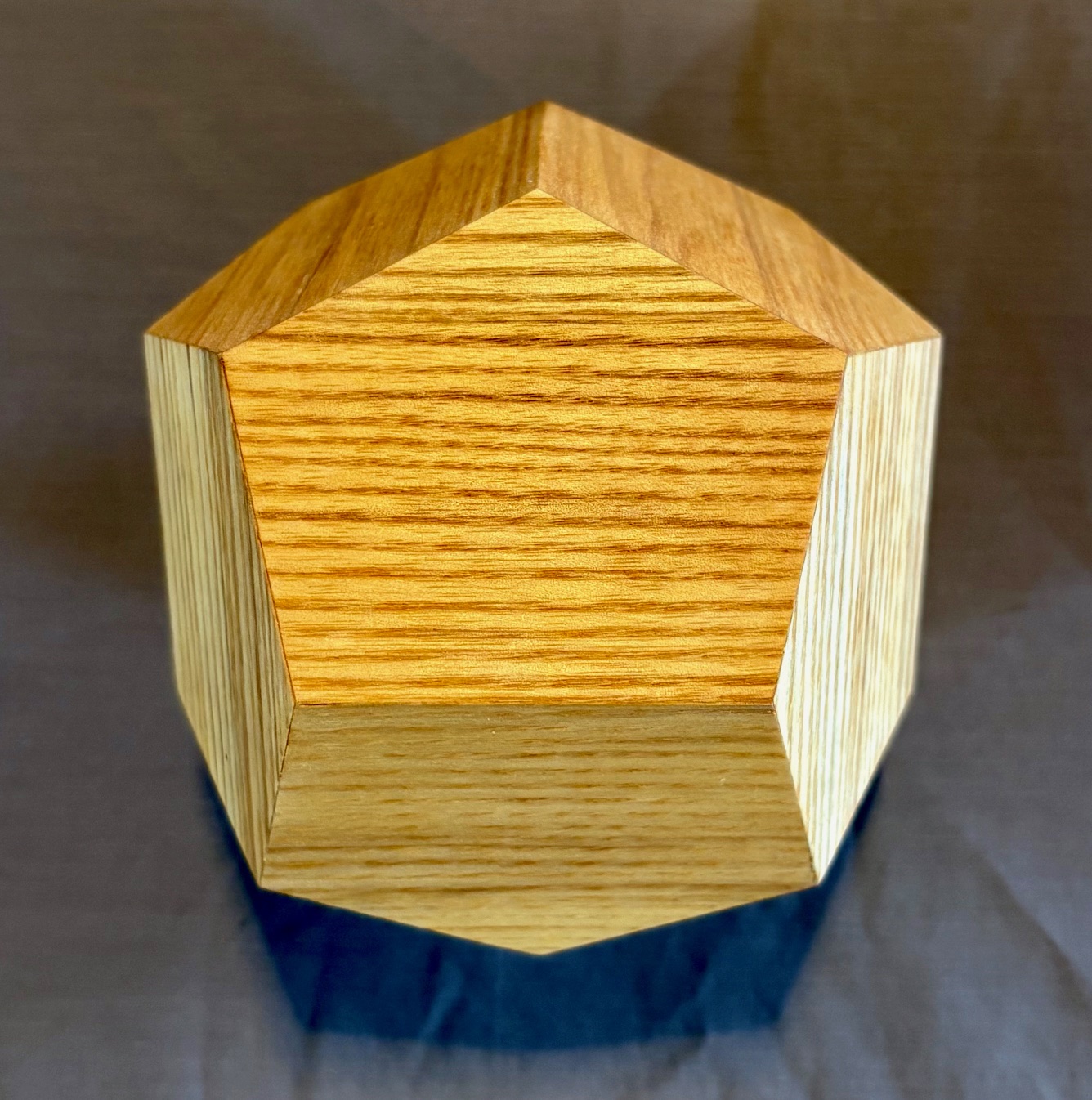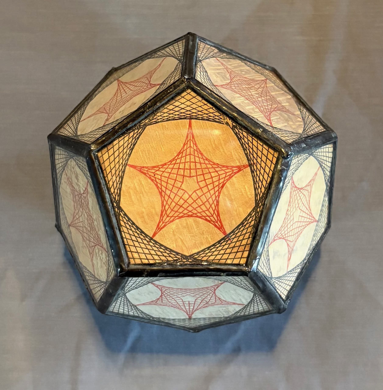 The model of the pentagonal dodecahedron pictured above is one I made before I took up woodworking. It’s glass with letterpress printed birch bark inside.