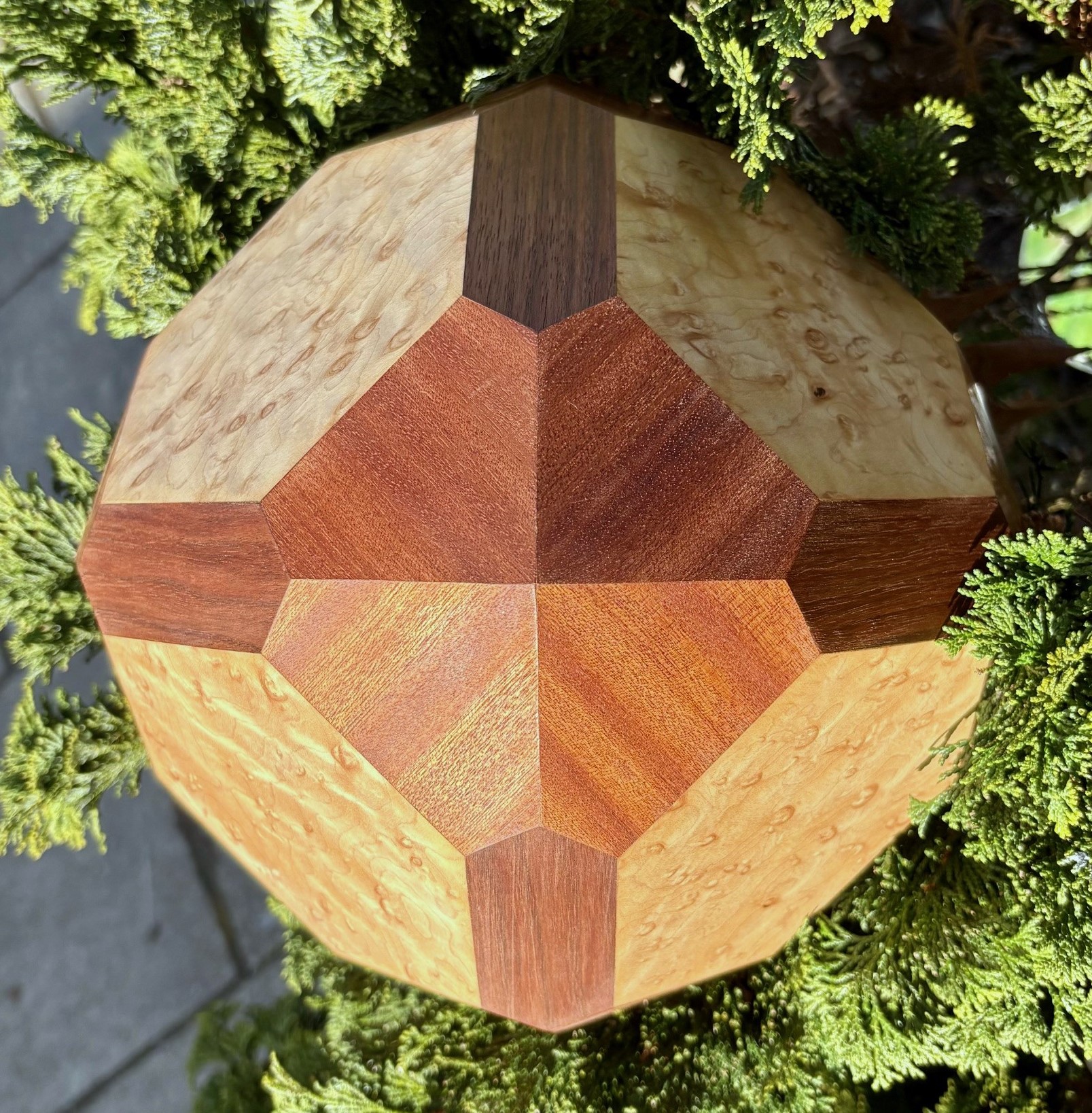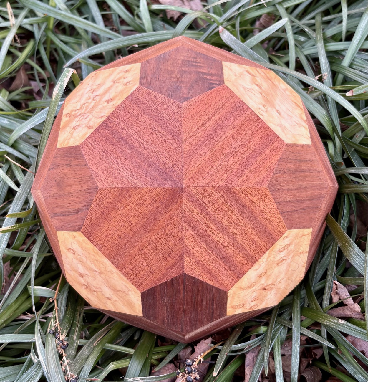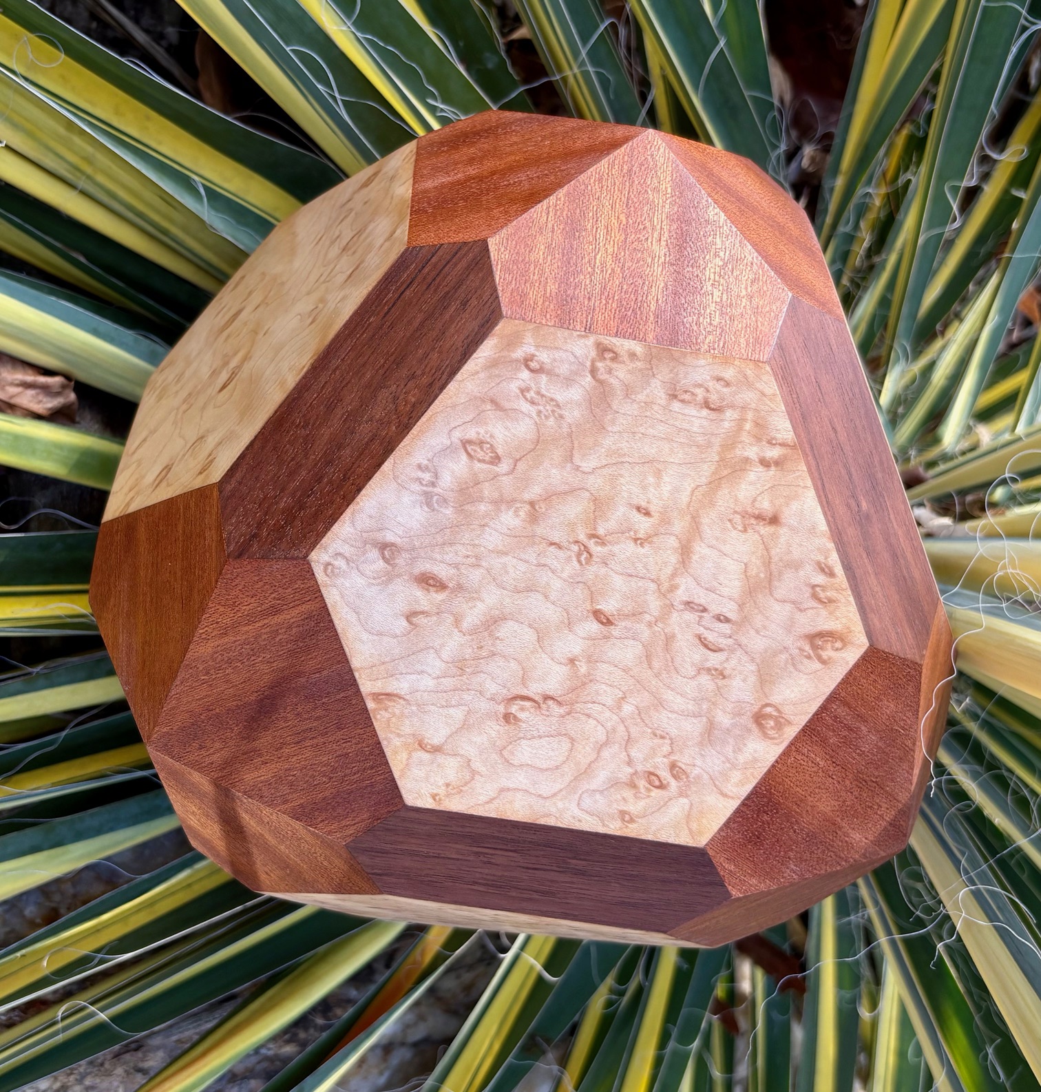 Model details: Both models are 10" across. Octahedron faces are birdseye maple, dodecahedron faces are black walnut, and trapezohedron faces are sapele.