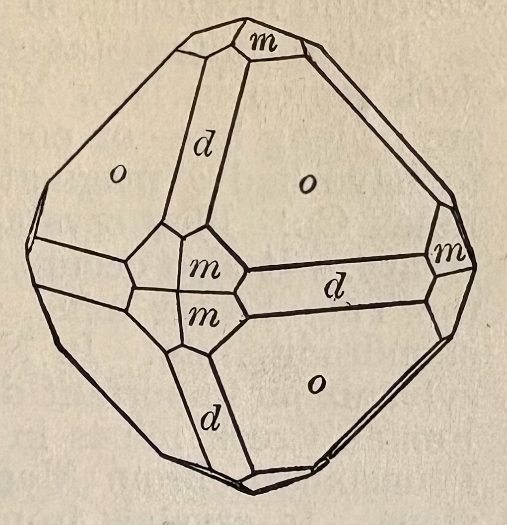 The best orientation to display this specimen happens not to correspond with the crystal’s symmetry axes, so here is another photo showing the crystal in a more traditional alignment. An image of a crystal drawing from Dana showing a combination of octahedral, dodecahedral, and trapezohedral forms matches pretty well.