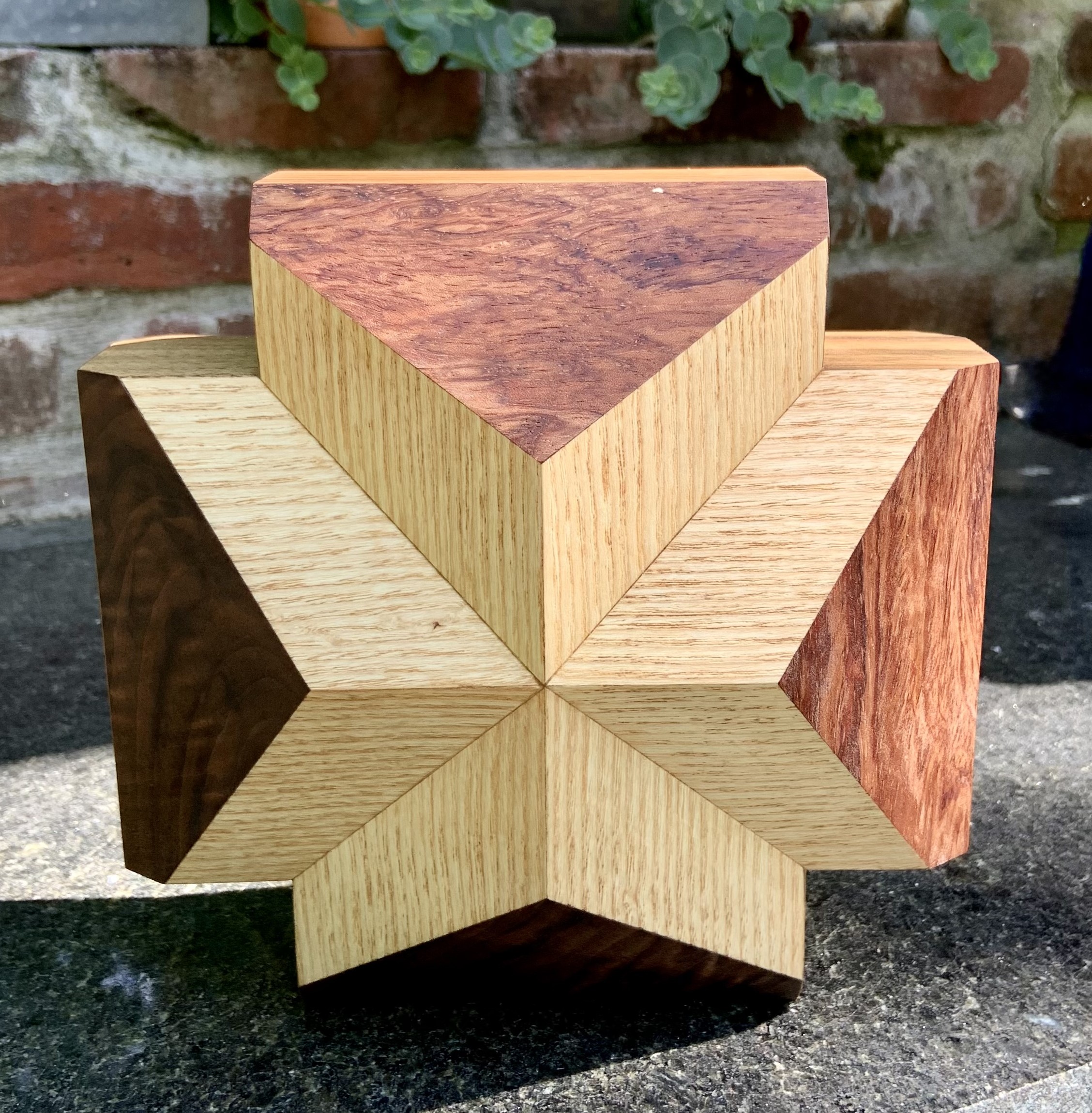 Small staurolite model - 6" high. Prism faces are shedua. Pinacoid faces are birdseye maple, canary, yellowheart, and bubinga.