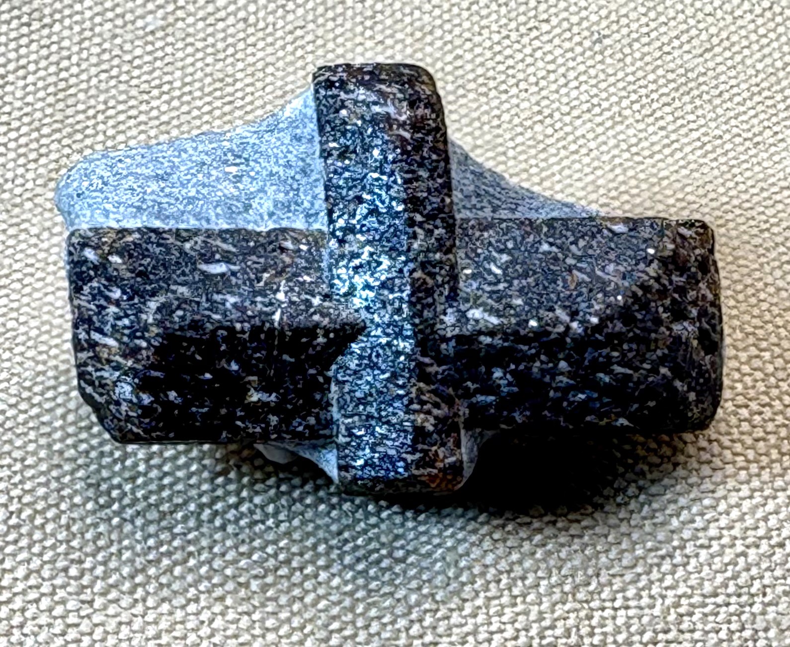When I was a kid, every attraction with any kind of geologic connection (museums, national parks, commercial caves) had a basket of staurolite fairy crosses for sale in the gift shop. Some of them were probably fakes, some of them were “improved” by a little judicious carving, and some of them had cheap findings glued to one end to turn them into pendants. I never bothered to buy one back then, because they seemed cheesy and incredibly common. Lately however, a well formed fairy cross is a little harder to come by. I’m keeping my eye out at mineral shows for a specimen that more closely resembles the form of the crosses I remember from my childhood, but this one from Russia will do nicely for now.